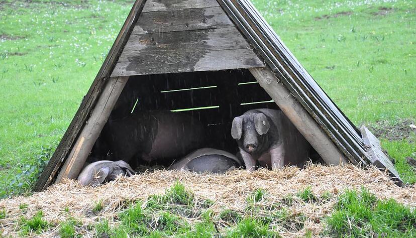 Auf keinen Fall vor die Tür wollen an diesem Tag die Eichelmastschweine auf der grünen Weide bei Wolpertshausen. Das Wasser kommt wie aus Eimern vom Himmel. Dass Schweine von Natur aus gerne kuscheln, zeigt sich da besonders gut. Von dem halben Dutzend Hütten auf der Weide sind nur wenige belegt. Statt sich auszubreiten, rotten sich die Schweine auf kleinem Raum im Stroh zusammen. „Sie verhalten sich wie Wildschweine, wenn schlechtes Wetter ist, suchen sie Schutz“, erklärt Rudolf Bühler.
