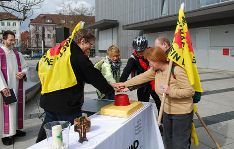 Symbolisch drückten die Umweltaktivisten nach dem Gottesdienst im Heilbronner Stadtgarten den roten Notschalter, um das AKW Neckarwestheim vom Netz zu nehmen. Foto: Klöppel