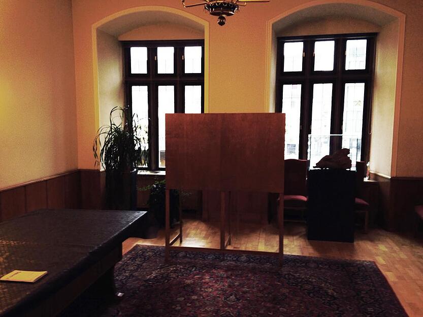 Das erste Wahllokal der Stadt - zumindest nach der Nummerierung - ist am Sonntagvormittag noch recht leer. Im Rathaus wurden bis gegen 11 Uhr 48 Stimmen abgegeben. Abgestimmt wird im Trauzimmer des Rathaus. Der Hinweis, dass das Werfen von Reis verboten ist, wirkt heute an dieser Stelle etwas deplatziert. Oder will die Stadtverwaltung schon vorbeugen, falls bei der Übertragung der Wahlergebnisse ab 18 Uhr im Rathaus zu heftig gefeiert wird?