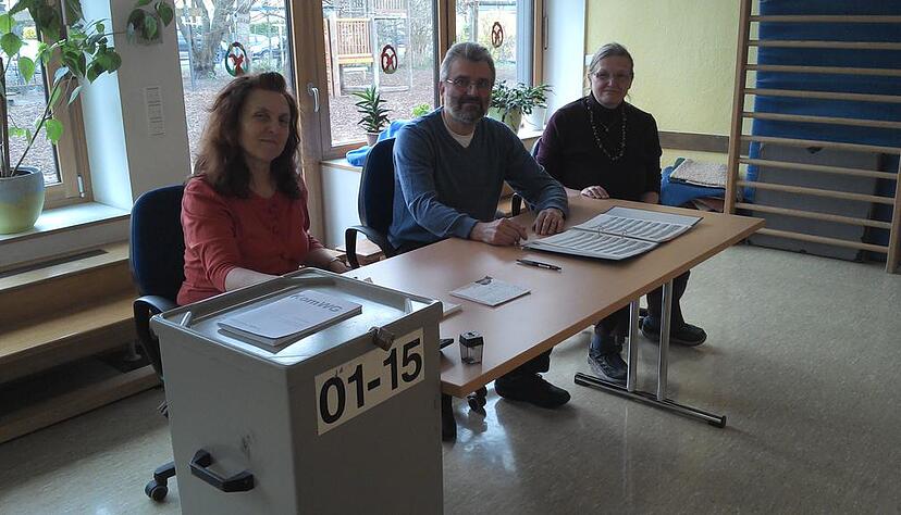 17 Prozent Wahlbeteiligung lautet die 14-Uhr-Bilanz von Wahlhelfer Michael Erb in Raum 2 des Städtischen Kindergartens Wartbergstraße. Von 873 Wählern haben 159 abgestimmt. "Aber jetzt zieht es ein wenig an", sagt Wahlhelferin Olga Schützle. "Der verkaufsoffene Sonntag war wohl keine gute Idee", meint Wahlhelferin Brigitte Erb. "40 Prozent Wahlbeteiligung hätten wir schon gern." (Foto: Olga Schützle, Michael und Brigitte Erb)