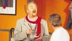 Noch immer ist alles locker in der Garderobe der Jagsttalbühne. "Ich schau heute zu, ich will euch doch endlich einmal live sehen", sagt Erika Vogel, während sie Uwe Buddenberg die Haare gelt. Schon alles Routine? "Nein, das soll es nie werden, sonst höre ich auf", sagt der Amateurschauspieler. Jede Rolle fordere ihn heraus und solle ihm alles abverlangen. Als Therapieraum sieht Buddenberg die Bühne nicht. Dann zieht er sich zum grauen Anzug die roten Turnschuhe an, die Dr. Chapmans "Hang zum Kleiderfetischismus" unterstreichen sollen.