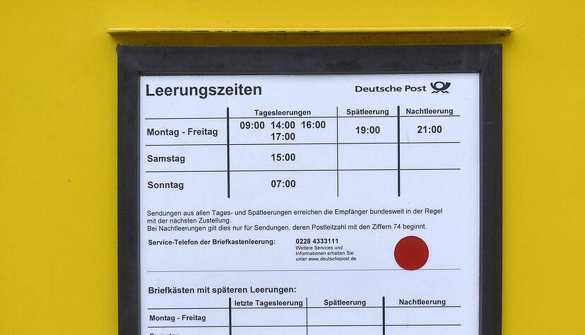 Wer am Samstag im Laufe des Tages einen Brief einwirft, kann sich einen Briefkasten suchen, der extra mit einem roten Punkt gekennzeichnet ist. Dieser rote Punkt signalisiert: Dieser Briefkasten wird auch am Sonntag geleert. In Heilbronn allerdings können sich Versender die Anfahrt am Wochenende sparen, denn die Post lässt die Sendungen einfach liegen.