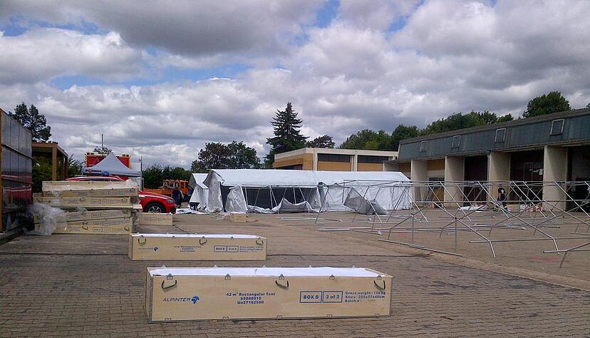 Sturmböen erschweren die Arbeiten. Sandsäcke auf den Planen verhindern, dass der Wind in die Zelte pfeift. Die Feldbetten müssen warten, bis die Zelte stehen. Deren Verankerungen werden zunächst in die Pflastersteine gebohrt. Lärm. Emsiges Treiben. Einsatzbesprechungen. Immer wieder wirbelt der Starkwind Staub in die Augen. Der Zeitplan verzögert sich. Aber Kreisbrandmeister Uwe Vogel lässt nicht den Hauch eines Zweifels aufkommen. "Wir sind seit acht Uhr morgens im Einsatz. Und wir werden den Auftrag erfüllen. Bis heute Abend sind wir fertig."