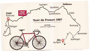 Vor 30 Jahren startete die Frankreich-Rundfahrt in Deutschland, so wie auch jetzt wieder, anno 2017. Diesmal in Düsseldorf, damals in Berlin. Das Rennen wurde anlässlich der 750-Jahr-Feier im Westteil der Stadt gestartet. Die Mauer stand ja noch. Dann flog der Tour-Tross über die DDR hinweg nach Baden-Württemberg. Dann war das Ländle dran. 219 Kilometer waren es von Karlsruhe nach Stuttgart. Fast mittendrin: Heilbronn.