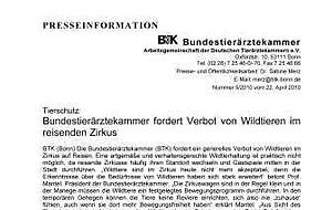 Peta weist darauf hin, dass sich auch die Bundestierärztekammer für ein Wildtierverbot im reisenden Zirkus ausspricht – bereits im April 2010 hatte die Kammer eine entsprechende Pressemitteilung herausgegeben. Eine Sprecherin der Bundestierärztekammer bestätigte die Gültigkeit dieser Forderung aus 2010 gegenüber stimme.de. Hier die Original-Pressemitteilung (als pdf):