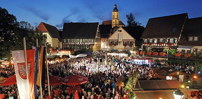 Das Erlenbacher Weinfest (Foto: Archiv/Veigel) wird 40. Da wissen die Besucher, was sie erwartet. Eine unterhaltsame Blasmusik, Zwiebel- und Peterlingkuchen und natürlich die Viertele, wie es sich für ein Weinfest immer gehört. Dennoch ist die 40. Ausgabe eine besondere, wenn vier Tage ab Freitag in den Gassen rund um den Marktplatz in gemütlicher Atmosphäre gefeiert wird.