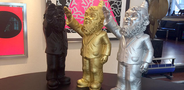 Drei solcher Zwerge sind bei Cameo im Fenster ausgestellt, in Gold, Schwarz und Silbern – um Missverständnissen vorzubeugen, liegt die Beschreibung aus Hörls Broschüre dabei. Neben den Hitler-Zwergen stehen da noch sogenannte Sponti-Zwerge (zeigen den Stinkefinger) und Hörls Erdmännchen.