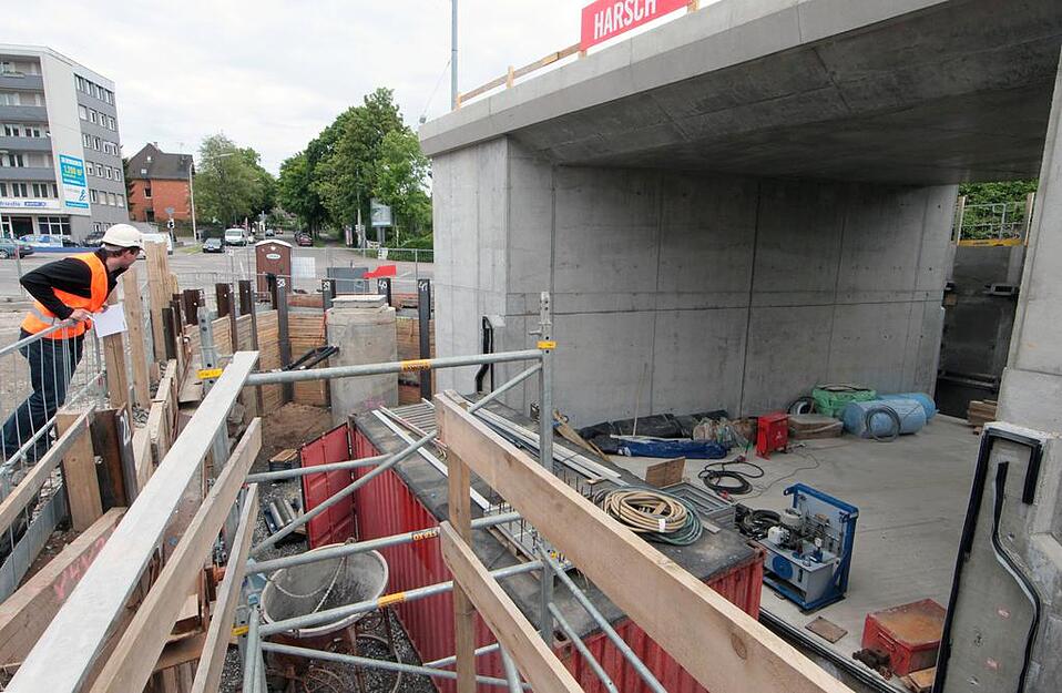 Der heikle Bauabschnitt der Stadtbahntrasse Nord soll in einem Rutsch durchgezogen werden. Die zwei riesigen Hydraulikpressen sollen den Brückenkoloss am Samstag von rund 15 Uhr an 18 Meter weit in seine Position drücken.