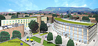 Am Aussehen des Hotels hat sich in den zurückliegenden Jahren, in denen dieses Projekt immer wieder für Gesprächsstoff gesorgt hatte, nichts verändert: „Es wird so gebaut, wie es auf dem Bauschild zu sehen ist“, versichert Straus. Noch offen ist, wie eine kleine Fläche von 500 Quadratmetern im Erdgeschoss des Hampton Hotels einmal genutzt wird. Der Architekt denkt unter anderem an hochwertige Gastronomie.
