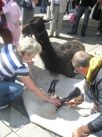 Der Tierpfleger des Lamas, Jürgen Schumann, hatte vermutet, dass Petrolina schwanger ist, trotzdem schien er ein wenig überrascht zu sein. „Sie war heute viel unruhiger als sonst“, sagt er. Als es soweit war, griff Irmgard Widmann das Neugeborene, damit es nicht auf den Boden fiel. Andere Passanten versuchten die Mutter durch Streicheln zu beruhigen. „Ich war das erste Mal bei so einer Geburt dabei“, freute sich Schumann. „Es ist ja zum Glück gut gegangen“, sagte Widmann.