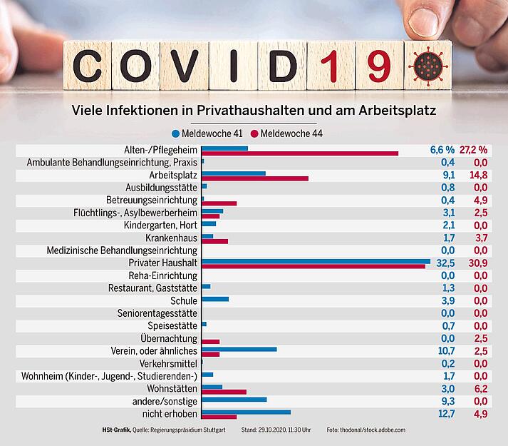 Stützen kann sich die Branche bei ihrer Argumentation auf aktuelle Zahlen, die zeigen, dass der Gastro- und Hotelbereich bisher nicht zu den wesentlichen Infektionstreibern im Land gehören. Das Landesgesundheitsamt Baden-Württemberg hat für die Kalenderwochen 41 bis 44 erhoben, wo sich die Menschen im Land mit dem Coronavirus angesteckt haben. Das ist natürlich nur bei den zurückverfolgbaren Fällen möglich. Im genannten Zeitraum waren dies 5127 von 24.122 Infektionen - das entspricht einem Anteil von exakt 21,3 Prozent.