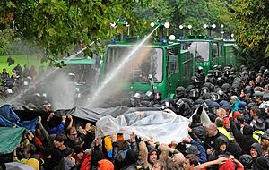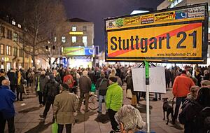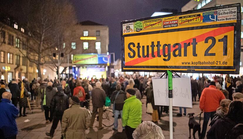 Der Baustart ist symbolisch. Am 2. Februar 2010 hebt unter den Augen der Politikprominenz ein Bagger den Prellbock von seinem angestammten Gleis im Stuttgarter Hauptbahnhof und transportiert ihn ein Stück ins Gleisvorfeld. 400 Gäste, darunter Verkehrsminister Peter Ramsauer (CSU), Bahnchef Rüdiger Grube und Ministerpräsident Günther Oettinger, sind zum Feiern gekommen. Zwei Bahnsteige weiter drängen sich Demonstranten, die mit Pfeifen, Vuvuzelas und "Lügenpack"-Rufen die Redner stören.