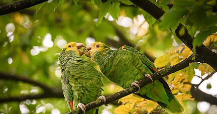 Begonnen hat die Amazonengeschichte 1984 mit einem einzelnen entflogenen oder ausgesetzten Vogel, dem vermutlich Tierfreunde einen Gefährten beigesellten. Tatsächlich wurde aus den beiden Gelbkopfamazonen ein Paar - das Geschlecht sieht man den Tieren am Äußeren nicht an -, das sich langsam, aber erfolgreich fortpflanzte und an die Umgebung anpasste. 1986 wurden die ersten Jungtiere gesehen, der Bestand wuchs langsam, aber stetig. "Es dauert etwa fünf Jahre, bis die Tiere geschlechtsreif sind", sagt Bianca Hahn. Und wenn sich ein Pärchen findet, bleibt es in der Regel lange zusammen. Aber dass es auch bei den Papageien "menschelt", davon kann Hahn viele Geschichten erzählen - von verlassenen, vermissten oder trauernden Papageien, von langen und enttäuschten Lieben, sorgenden Müttern und allein erziehenden, tragisch überfordertern Vätern. "Sie haben alle ihren eigenen Charakter, eine eigene Persönlichkeit. Das fasziniert mich, und weil die Population so klein ist, kann man das Sozialverhalten auch sehr gut beobachten."