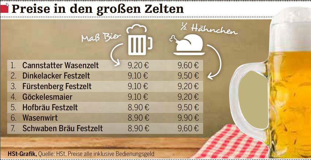 Die sind in diesem Jahr nämlich gesalzen. In vier Zelten hat die Maß Bier inzwischen inklusive Bedienungsgeld die Neun-Euro-Marke geknackt, das halbe Hähnchen liegt in allen sieben Zelten darüber. Hintergrund ist, dass die Stadt Stuttgart wegen der erhöhten Sicherheitsvorschriften die Fluchtwege ausbauen musste. Die Wirte werden über die Platzgebühren an den Kosten beteiligt. "Es ist die erste Erhöhung seit fünf Jahren", erklärt Stadt-Sprecher Andreas Scharf. Höhere Kosten für die Betreiber bedeuten höhere Preise für die Besucher. So funktioniert Marktwirktschaft auf dem Wasen.