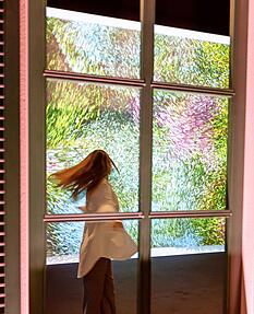 Das Besondere bei Monet sei gewesen, dass er die Grundfarben nicht vorher vermischte, sondern sie getrennt auftrug, erklärt Elisabeth Schedensack. Vom Atelier geht es weiter zur Inszenierung von Monets Garten, der weltberühmten Gartenlandschaft in Giverny in der Normandie. Über die japanische Brücke, umgeben von Seerosen und herabhängenden, lilafarbenen Kunstlianen, geht es in das Haus des französischen Künstlers.