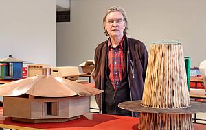 Zwei runde Kippfenster sorgen für frische Luft. Auch wenn der 64-Jährige kein Baumeister ist, perfekt sollen seine Häuser sein: Modelle, die als soziale Skulptur Assoziationen freisetzen über Möglichkeiten von Architektur.