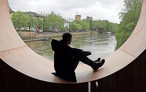 Als Rückzugsraum versteht Thomas Schütte, der schon Hotels für Vögel entworfen hat, sein One Man House: ein Ort, von dem aus wir die Außenwelt beobachten. Einige Meter über der Erde blickt man auf die Trauerweiden am Neckar, auf den Fluss und zum Götzenturm und fühlt sich wie in einer Schiffskajüte.