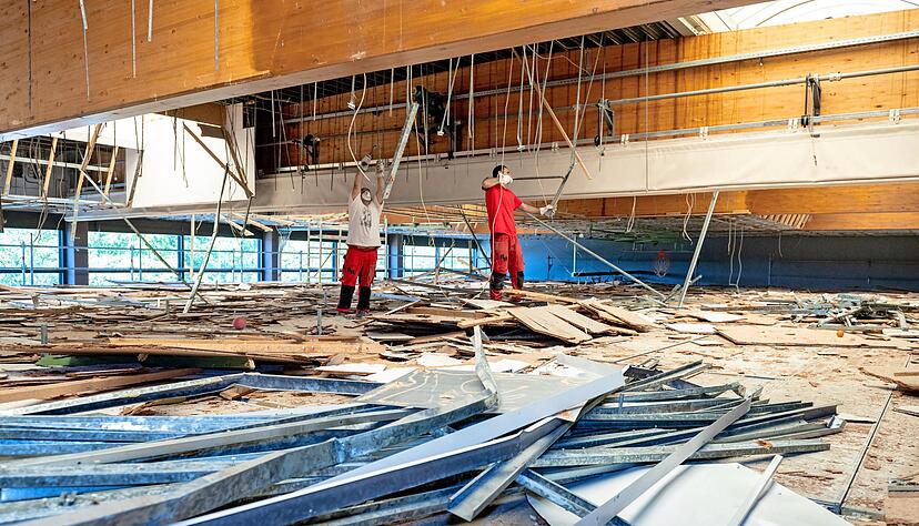 Die Halle ist komplett eingerüstet, damit die Männer auf einem Zwischenboden in etwa vier Metern Höhe unterhalb des Dachs Stück für Stück abtragen können. Die Burgfriedenhalle Neuhütten gleicht fast einem Rohbau. Seit 20. Mai wird sie entkernt. Die Vereine sind anderswo untergekommen, die Schulen machen Freiluft-Sport. Ende September/Anfang Oktober soll die Generalsanierung fertig sein. Ein ehrgeiziges Unterfangen bei einem Gesamtvolumen von 3,54 Millionen Euro. "Wir sind im Zeitplan", sagt Thomas Löffelhardt vom Wüstenroter Bauamt.