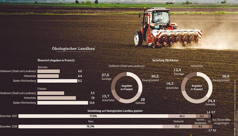 Die Zahl der biologisch wirtschaftenden Bauern steigt. In Baden-Württemberg von 2012 bis 2017 um knapp 30 Prozent, erklärt das Landwirtschaftsministerium. Die Fläche sei im selben Zeitraum sogar um 42 Prozent gewachsen. Dieser Trend gilt auch für die Region Heilbronn und Hohenlohe.