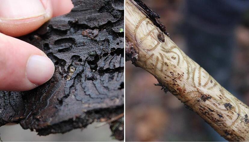 Fraßgänge zerstören die Nährstoffleitbahnen unter der Rinde