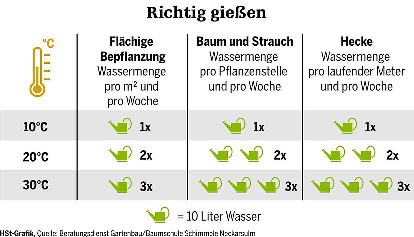 Florian Leiensetters Wunsch wäre "mal wieder Landregen". Doch wie gießt man ohne ihn richtig? Das ist bei der ungewöhnlichen Hitze- und Trockenheitsphase eine Existenzfrage für die Pflanzen. Die Baumschule Schimmele gibt ihren Kunden ein Kärtchen mit Tipps mit (siehe Infografik).