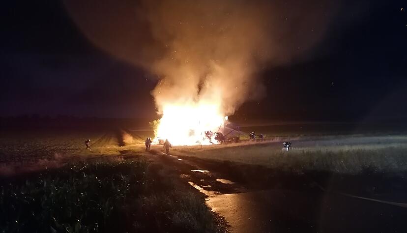 Um 22.02 Uhr am Samstagabend sei der Alarm über einen Brand in einer Scheune in Ilsfeld Ilsfeld eingegangen, sagte Feuerwehrkommandant Steffen Heber. Zuvor war ein Blitz eingeschlagen. Als die Feuerwehr auf der Wiese an der L1100 etwas außerhalb der Ortsbebauung von Ilsfeld ankam, habe die Scheune in vollem Brand gestanden. Das Dach des Strohlagers brach rasch ein. "Wir haben sofort mit der Brandbekämpfung begonnen." Der Schaden liegt bei 40.000 Euro.