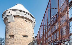 Mitte April müssen die Handwerker fertig sein. Dann wird der spektakuläre Zugang an der Südseite des 28,50 Meter hohen Beton- und Sandsteinbauwerks seiner Bestimmung übergeben: 16 Meter lang, neun Meter hoch, zwei Meter breit. Hinter teils gelochten Cortenstahlplatten führen 42 Stufen zu einem von zwei Eingängen, die nach dem Abbruch einer Zugangsrampe seit 1951 vom Schlachthof her, verschlossen blieben. Drei mannshohe Stahlstelen warten noch auf Info-Tafeln zur Turmhistorie und die Namen der Spender, die auf Initiative der Bürgerstiftung unter dem Motto "Mahnen, erinnern, denken" 260.000 Euro zur Finanzierung des neuen Zugangs beisteuerten.