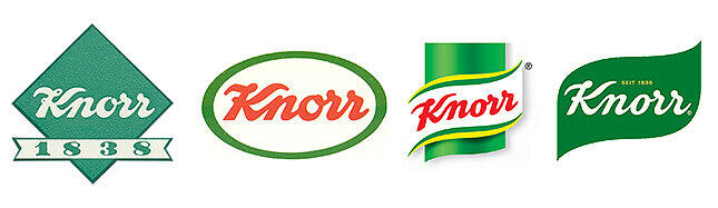(v.l.) Das Logo von 1948 wurde bis in die 1960er Jahre verwendet, das Oval verwendete Knorr ab 1961, 2004 zeigte sich das Unternehmen noch bunt, bevor es 2019 die Farbgebung wieder zurückhaltender gestaltete: