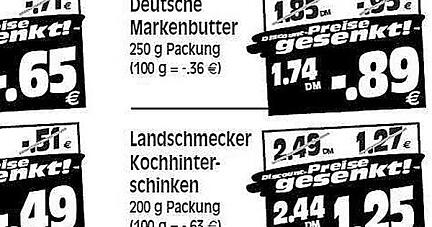 Ein Blick auf die damaligen Anzeigen und Prospekte zeigt, wie sehr gerade der Lebensmittelhandel bemüht war, Transparenz bei den Preisen herzustellen. Zumindest die Discounter, aber auch Modegeschäfte zeichneten in ihrer Werbung die Preise in den ersten Wochen nach der Euro-Einführung durchgängig in alter und neuer Währung aus. Manche senkten den Preis quasi als Marketing-Instrument bewusst um mindestens einen Cent. So kostete der Becher Yoghurt nach einer Stimme-Übersicht am 4. Januar 2002 bei Aldi, Kaufland, Lidl und Norma jeweils 0,29 Cent, am 31. Dezember hatte er noch 59 Pfennig gekostet, das waren gut zwei Pfennige mehr. Ein Pfund Kaffee war für jeweils 2,49 Euro zu haben (Lidl: 2,35). Der D-Mark-Preis lag fünf Tage zuvor noch bei 4,98 und damit umgerechnet einige Pfennige höher als der Euro-Preis.