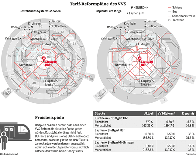 Immerhin 1,20 Euro bei jeder Fahrt oder 24 Euro beim Monatsticket: So viel könnte ein Pendler zwischen Bönnigheim oder Kirchheim am Neckar (beide Landkreis Ludwigsburg) und dem Stuttgarter Hauptbahnhof sparen, wenn die Tarifreform wie geplant umgesetzt wird. Der VVS Aufsichtsrat will das komplizierte Gebilde aus 52 Zonen rund um Stuttgart zu fünf Ringen eindampfen.
