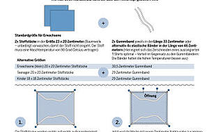 2 x Stoffstücke in der Größe 23 x 20 Zentimeter (Baumwolle – unbedingt vorwaschen, damit der Stoff nicht eingeht. Der Stoff muss eine Waschtemperatur von 90 und mehr Grad Celsius vertragen)