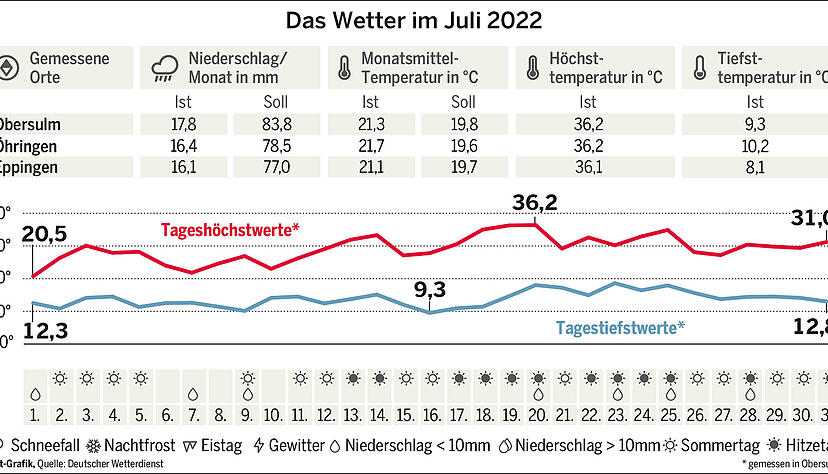 Die Durchschnittstemperatur lag bei der Wetterstation in Öhringen bei 21,7 Grad, das sind 2,1 Grad über dem langjährigen Mittelwert. In Obersulm-Willsbach und in Eppingen-Elsenz fielen die Werte etwas geringer aus. Der Juli 2022 belegt damit Platz sechs seit Beginn der Wetteraufzeichnung in Öhringen 1947. Während in Eppingen und Öhringen der 19. Juli der heißeste Tag war, war es in Willsbach der 20. Juli, ebenfalls mit 36,2 Grad.