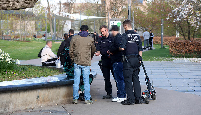 Auch am Mittwochabend, 9. April, haben Bereitschaftspolizisten und Polizisten in zivil am Flügelnussbaum die Drogenszene kontrolliert. Das Ergebnis: Es wurden mehrere Platzverweise erteilt wegen Alkoholkonsums, der dort verboten ist. Außerdem sei festgestellt worden, dass ein Mann unter Drogeneinfluss mit einem E-Roller gefahren sowie der Roller nicht versichert ist. Die kontrollierten Personen hätten sich ruhig verhalten, sagt ein Polizist vor Ort. „Wir wollen Flagge zeigen“, erklärt Polizeisprecher Frank Belz die auffällige Polizeipräsenz.