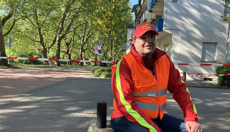 9:04 Uhr: Satte Beats als Ansporn für die Läufer: Ingo Krämer von der DLRG passt bei der Götzenturmbrücke der Strecke auf und hat einen Lautsprecher mitgebracht.