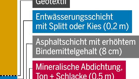 "Die Fläche wird nicht einfach mit Erde abgedeckt, sondern es entsteht ein hochtechnisiertes Bauwerk", berichtet Thorsten Simon, Ingenieur für Abfallwirtschaft. Der Müll wird regelrecht eingekapselt. Zur Oberflächenabdichtung gehören insgesamt sechs Schichten, jede einzelne muss von externen Prüfern abgenommen werden, so will es die Vorschrift im Deponiebau. Der Asphalt etwa wird nach einem genormten Messverfahren geprüft. "Da kommt eine sechsstellige Summe an Kosten zusammen", erläutert Simon.