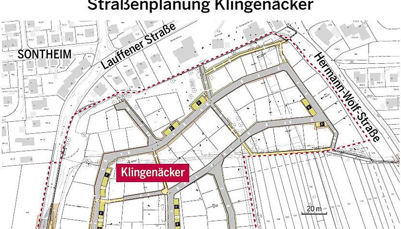 Noch dieses Jahr sollen im Sontheimer Neubaugebiet Klingenäcker die Erschließungsarbeiten starten. Zunächst werden Leitungen verlegt, 2021 beginnt der Straßenbau. Der Heilbronner Gemeinderat hat dafür 3,7 Millionen Euro reserviert. Das südlich des Orts oberhalb der evangelischen Kirche liegende Plangebiet umfasst 7,56 Hektar mit rund 90 Grundstücken für 124 Gebäudeeinheiten.