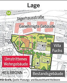 Bei einer Gegenstimme und vier Enthaltungen hat der Gemeinderat dem umstrittenen Bebauungsplan "Areal Jägerhausstraße 104", der den Bau eines Wohngebäudes in direkter Nachbarschaft westlich der denkmalgeschützten Villa Fuchs vorsieht, zugestimmt. Der Entwurf wird jetzt öffentlich im Technischen Rathaus ausgelegt. Bis zum Satzungsbeschluss und der Zustimmung durch das Regierungspräsidium dauert es aber noch Monate. Nicht Teil der Planung sind die vier Gebäude mit 59 Wohnungen, die an der Jägerhausstraße entstehen.