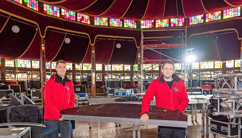 Die schweren roten Samtvorhänge sind an ihrem Platz unter dem Zeltdach, erste Stuhlreihen und Tische sind montiert. Auf der Bühne in der Mitte turnen noch Arbeiter herum, bevor sie Anfang der Woche den Artisten für ihre Proben Platz machen.