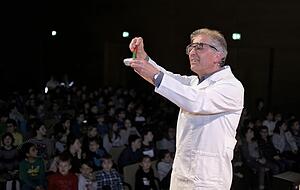 Richtig laut wird es, als er Wasserstoff in eine Seifenblasenlösung gibt und anzündet: Boing, das ist der Knallgas-Effekt. Nach einer Stunde hat der Mann mit Schutzbrille und weißem Kittel die Kinder für Chemie begeistert. Als er fragt, wer dieses tolle Fach nach dem Abitur studieren möchte, geht viele Hände nach oben.