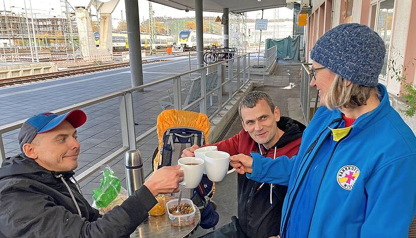 Ein Mann kommt vorbei und erklärt in den wenigen Worten, die er auf Deutsch kann, dass er eigentlich nur etwas heißes Wasser bräuchte, um seine Thermoskanne zu füllen. Darin, zeigt er stolz, liegen getrocknete Hagebutten. "Reich an Vitamin C und gut für die Nieren", erklärt er. Es stellt sich heraus, dass der Mann aus der Ukraine stammt, aus Butscha genauer gesagt, und sich just an diesem Tag auf den Weg zurück in die Heimat macht. "Zweieinhalb Tage in Bus und Bahn", hält er fest.