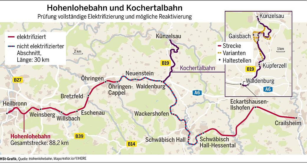 Weil der Gewerbepark Hohenlohe und Gaisbach kräftig gewachsen sind und die Künzelsauer Innenstadt mehr Berücksichtigung findet, könnte sich das Blatt für die Kochertalbahn nun wenden. Der unverhältnismäßig teure Umbau von Tunneln im Haller Bereich hatte die Kosten-Nutzen-Rechnung für die Hohenlohebahn 2012 ins Minus gezogen. Nun stehen günstigere Techniken bereit. Ende 2019 hat das Land den Fahrplan auf der Hohenlohebahn um einen Stundentakt erweitert - allerdings sieht der Vertrag mit der Westfrankenbahn bis 2031 nur den Einsatz optimierter Dieselloks vor.