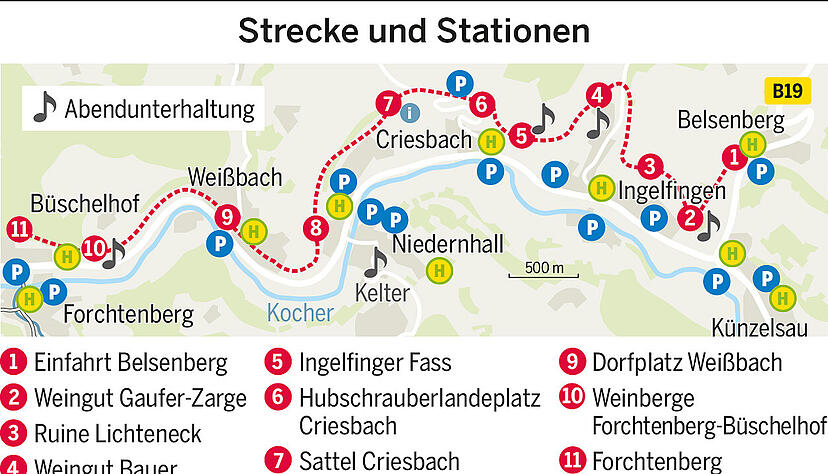 16 Kilometer, elf Stationen, jede Menge Essen und noch mehr Wein: Das erwartet die Menschen am Wochenende bei der Genießertour, die von Belsenberg nach Forchtenberg durchs Kochertal führt. Vieles ist altbekannt, nur beim Pendelverkehr gibt es Abstriche.