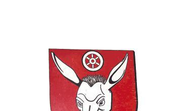 Pfedelbach Etwas finster blickt er drein, der Esel mit den langen Ohren (Foto: Müller). Ob ihm das Rad zwischen den beiden Lauschern nicht gefällt ? Seit 1956 hat es ihm ein Wappenmaler verpasst. Wer durch den Pfedelbacher Teilort Oberohrn fährt oder spaziert, kann dieses Wappen überm Eingang zum alten Rathaus sehen.