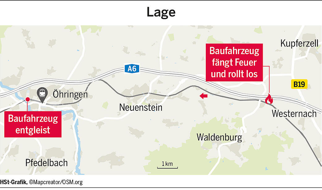 Wie berichtet, war die Baumaschine bei Gleisarbeiten im Bereich von Waldenburg im Einsatz. Sie begann zu kokeln, es entwickelte sich ein Feuer. Das Fahrzeug auf Schienen setzte sich in Bewegung. Feuerwehren und Polizei waren im Stress. Sie begleiteten das Gefährt so gut wie möglich. Im Öhringer Hauptbahnhof wurde es kontrolliert durch eine spezielle Vorrichtung zum Entgleisen gebracht. Niemand wurde verletzt. Was das Feuer auslöste, ist unbekannt. Unfallermittler der Bundespolizei gehen der Frage nach.