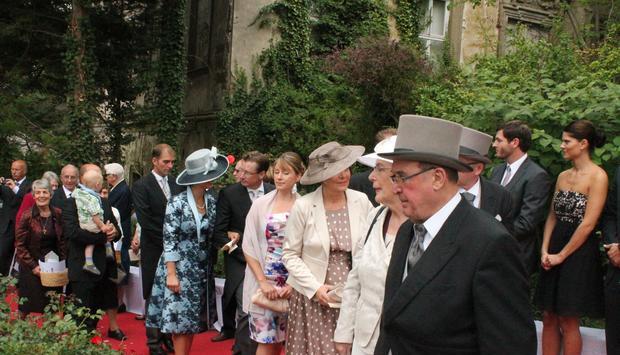 Die Zeremonie in der Kapelle wurde per Lautsprecher auf dem Platz vor dem Eingang zur Burg übertragen, wo beinahe alles saß, was in Hohenlohe Rang und Namen hat. Der Kocherstettener Pfarrer Wilfried Härpfer leitete den Gottesdienst, der vom Posaunenchor Kocherstetten und anderen Musikern begleitet wurde. Zuvor waren die Braut mit ihrer gut fünf Meter langen Schleppe sowie ihr Vater im Vierspänner vorgefahren. Vor dem Eingang zur Burg wurde sie unter dem Beifall der Gäste von ihrem Bräutigam empfangen.