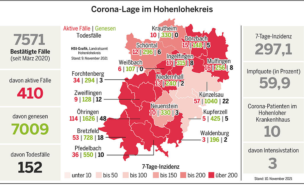 Das Landesgesundheitsamt meldete am Mittwochnachmittag eine Inzidenz von 297,1 für den Hohenlohekreis. So hoch lag dieser Wert noch nie seit Ausbruch der Corona-Pandemie. Der Höchststand an Neuinfektionen innerhalb einer Woche war am 2. April 2021 mit einer Inzidenz von 285,5 verzeichnet worden. Allein am Mittwoch gab es 74 weitere Fälle.