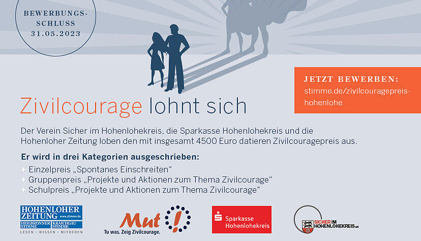 Ab sofort können sich Bürger melden, die Mut gezeigt und andere Menschen vor Straftaten oder anderem Unbill bewahrt haben. Der 2018 gegründete Präventionsverein „Sicher im Hohenlohekreis“, die Sparkasse Hohenlohekreis und die Hohenloher Zeitung loben den Zivilcouragepreis zum dritten Mal aus. Er ist mit 4500 Euro dotiert. Der Bewerbungsschluss ist vom 31. Mai auf den 30. Juni verlängert worden, die Jury tagt am 28. Oktober, die Ehrung der Preisträger findet am 23. November in der Sparkasse in Künzelsau statt.