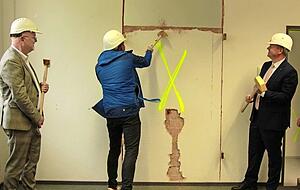 Männer in Anzügen und mit gold-glänzenden Vorschlaghämmern in der Hand üben rohe Gewalt aus, dreschen auf die mit einem gelben X markierte Wand ein. Die quittiert das Ganze zunächst mit massiver Gleichgültigkeit, lediglich ein paar Staubkörner rieseln zu Boden. Doch es ist Bürgermeister Stefan Neumann, der der Wand den Kampf ansagt und den Hammer nicht ruhen lässt, bis zumindest die Hälfte in Bruchstücken zu seinen Füßen liegt.