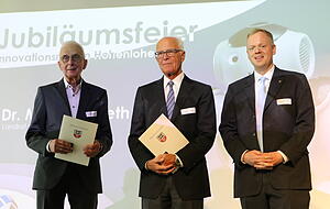 Sie hatten entscheidenden Anteil daran, dass die Innovationsregion Hohenlohe seit 2000 zu einem Erfolgsmodell wurde, das es so weder im Land noch im Bund gibt. Für ihre großen Verdienste um die Verzahnung von Wirtschaftsunternehmen, Bildungsträgern und staatlichen Behörden zeichnete Landrat Matthias Neth bei der Jubiläumsfeier des Industrienetzwerks drei "Männer der ersten Stunde" mit der Ehrenmedaille des Kreises aus, die nur ganz selten verliehen wird. Der langjährige Vorsitzende Thomas Philippiak bekam sie in Gold, sein einstiger Stellvertreter Gerhard Hettinger (verhindert) und der ehemalige Geschäftsführer Kurt Finkenberger in Silber.