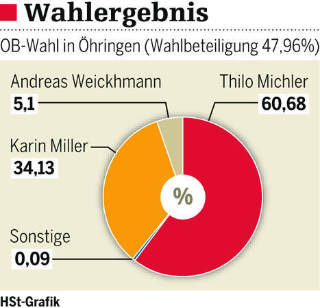 Soeben hat Michler (37) die Öhringer Oberbürgermeisterwahl gewonnen – und zwar deutlich. 60,68 Prozent der abgegebenen Stimmen stehen für den Noch-Bürgermeister von Zaberfeld (Landkreis Heilbronn) zu Buche. Für Karin Miller (48) bleiben 34,13, für Andreas Weickhmann gar nur 5,1 Prozent. Die Wahlbeteiligung liegt bei 47,96 Prozent. „Das ist zu wenig, liebe Öhringer“, tadelt Noch-OB Kübler.